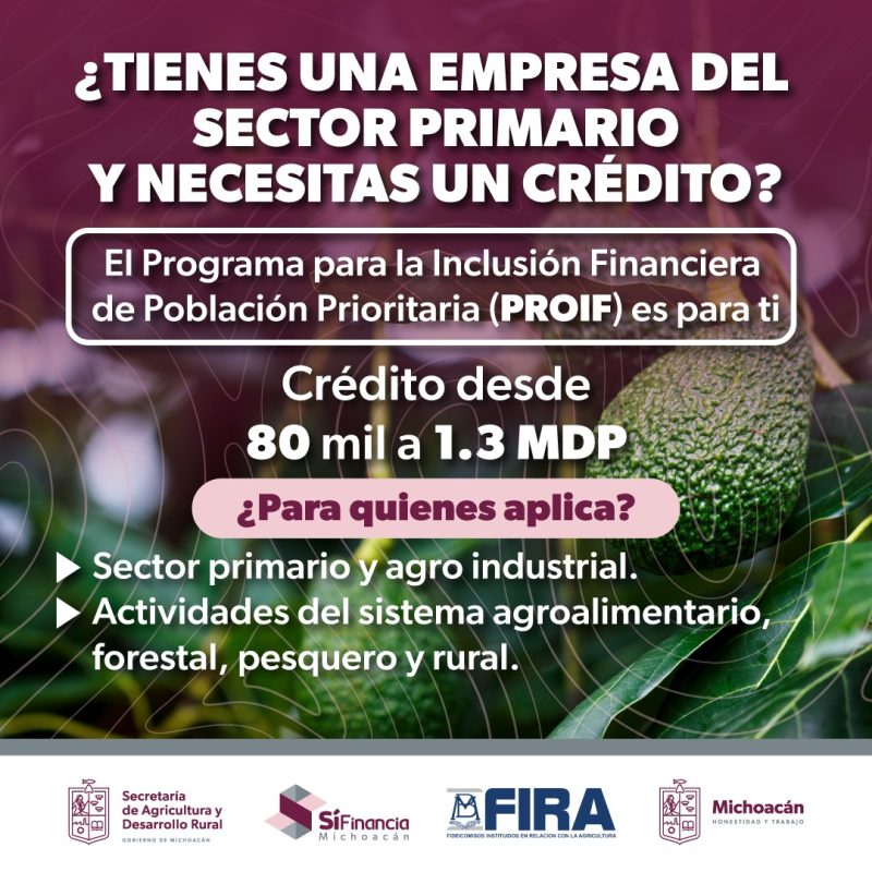 Al respecto, resaltó que el PROIF es un crédito respaldado por Sí Financia a través de instituciones financieras y representa un esfuerzo interinstitucional en coordinación con la Secretaría de Agricultura y Desarrollo Rural (Sader) y con el Fideicomiso Instituido en Relación con la Agricultura (FIRA), para brindar opciones crediticias al sector económico primario de Michoacán.