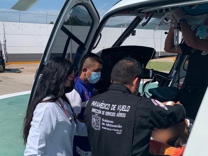 Huetamo, Mich., a 8 de agosto del 2022.- En aras de garantizar la salud, los paramédicos adscritos a la Dirección de Servicios Aéreos de la Secretaría de Seguridad Pública (SSP), trasladaron vía aérea a una pequeña, menor de edad, quien requería de atención médica especializada.