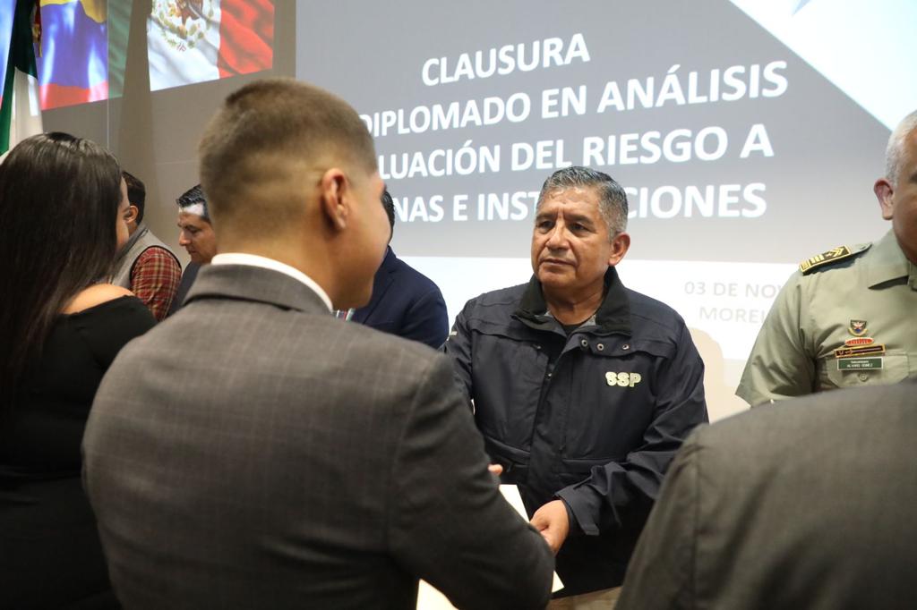 Morelia, Mich., 3 de Noviembre del 2023.- Gracias a la constante colaboración estrecha con la Policía Nacional de Colombia, la Secretaría de Seguridad Pública (SSP) culminó este viernes el Diplomado en Análisis y Evaluación del Riesgo a Personas e Instalaciones; evento encabezado por el titular José Alfredo Ortega Reyes, en el cual se busca generar una agenda de riesgos estatal.