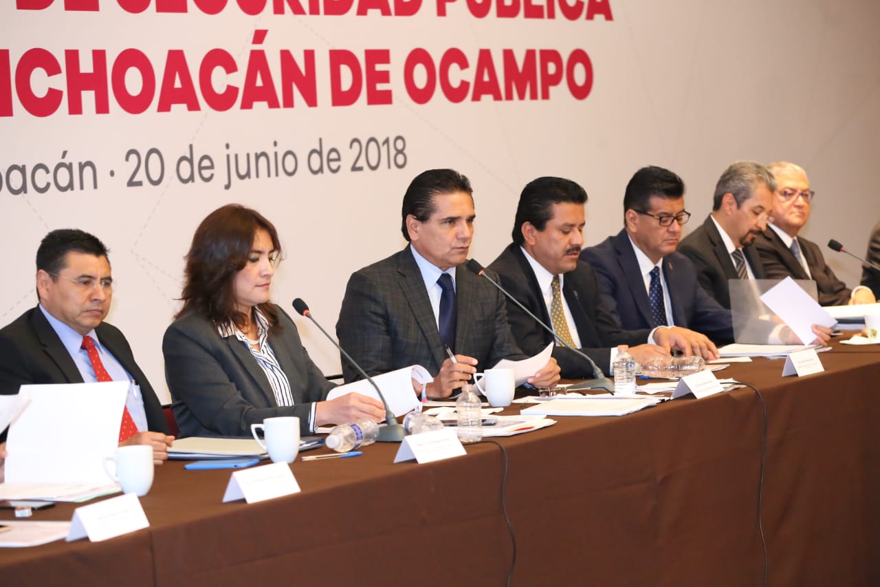 Morelia, Michoacán, a 20 de junio de 2018.- La delincuencia no se volverá a apoderar de Michoacán, sentenció el Gobernador Constitucional Silvano Aureoles Conejo, durante la Primera Sesión Ordinaria 2018 del Consejo Estatal de Seguridad Pública.
