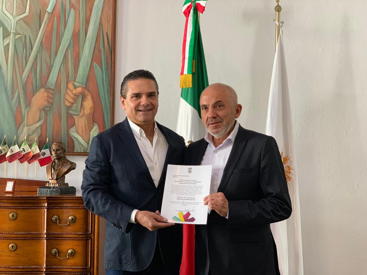 Morelia, Michoacán, a 18 de mayo de 2019.- Este día, el Gobernador del Estado, Silvano Aureoles Conejo, entregó nombramiento de director de la Orquesta Sinfónica de Michoacán (OSIDEM) a Román Revueltas Retes, quien será el encargado de dirigir la prestigiada Orquesta durante los siguientes conciertos.
