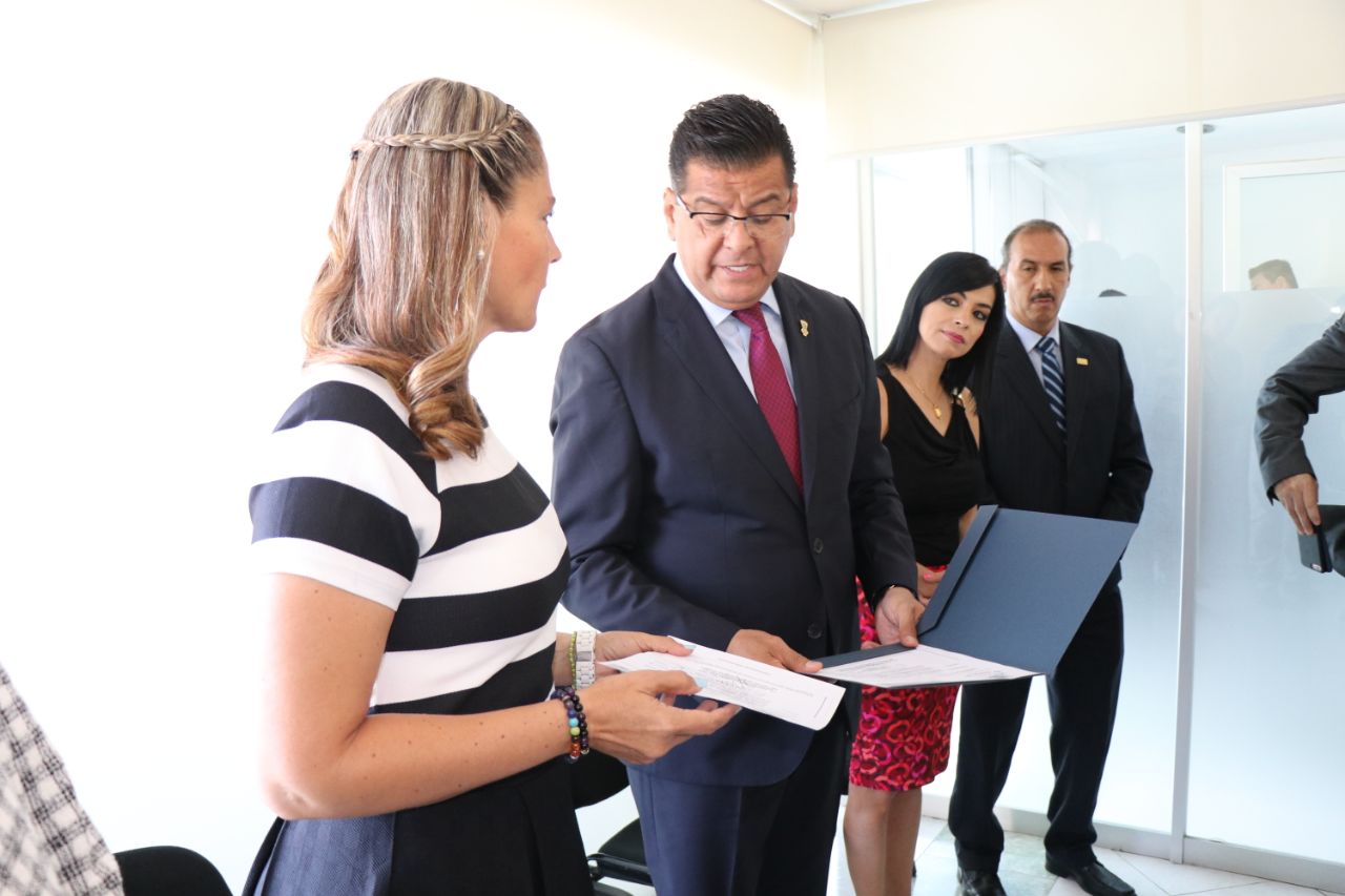 Acompañado por personal administrativo y operativo de la Dirección, Corona Martínez hizo la entrega del nombramiento a Zamudio Ibarra, a quien encomendó a trabajar de manera transparente y digna, con la visión de abonar a fomentar en la sociedad las buenas prácticas y medidas de prevención para evitar delitos que ayuden a mantener un estado armónico.