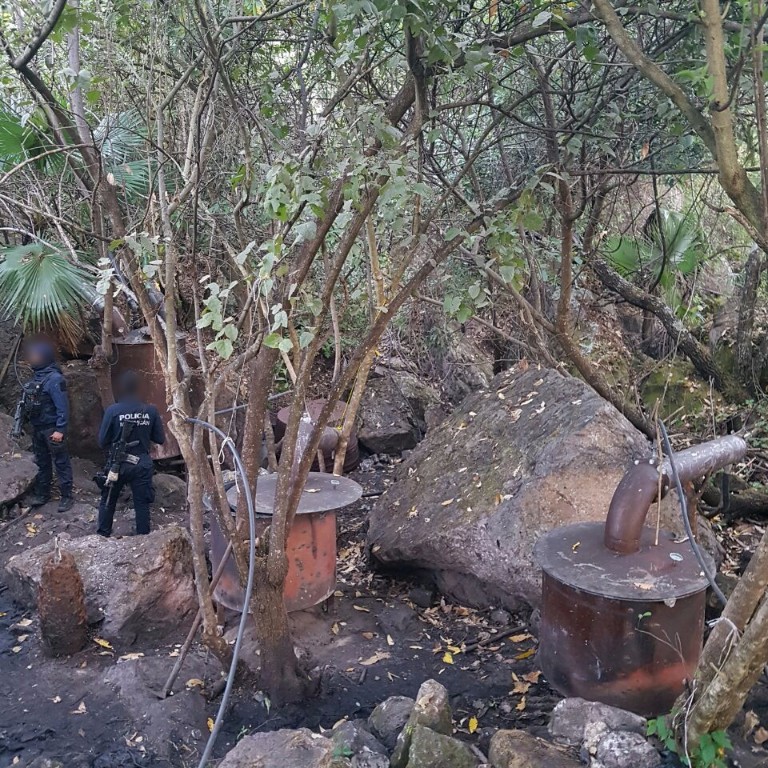 Además, cinco tambos de metal vacíos; una olla con capacidad mil 500 litros de agua llena; un contenedor de plástico de mil litros con mangueras adheridas; un costal de plástico con pedazos de aluminio y tres bidones con sustancia líquida.