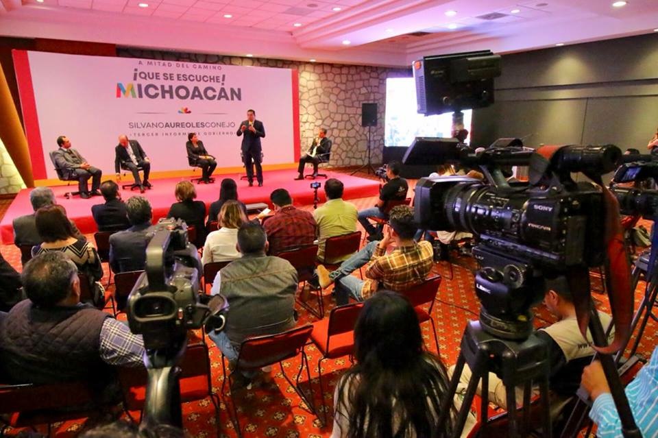 En este ejercicio de diálogo, los panelistas atendieron preguntas de periodistas y comunicadores de Morelia, así como otras que fueron planteadas en video por medios de comunicación de la región Oriente y de Huetamo, al igual que las formuladas por Erik Avilés Martínez, director general de Mexicanos Primero capítulo Michoacán, y representante de la sociedad civil en este encuentro.