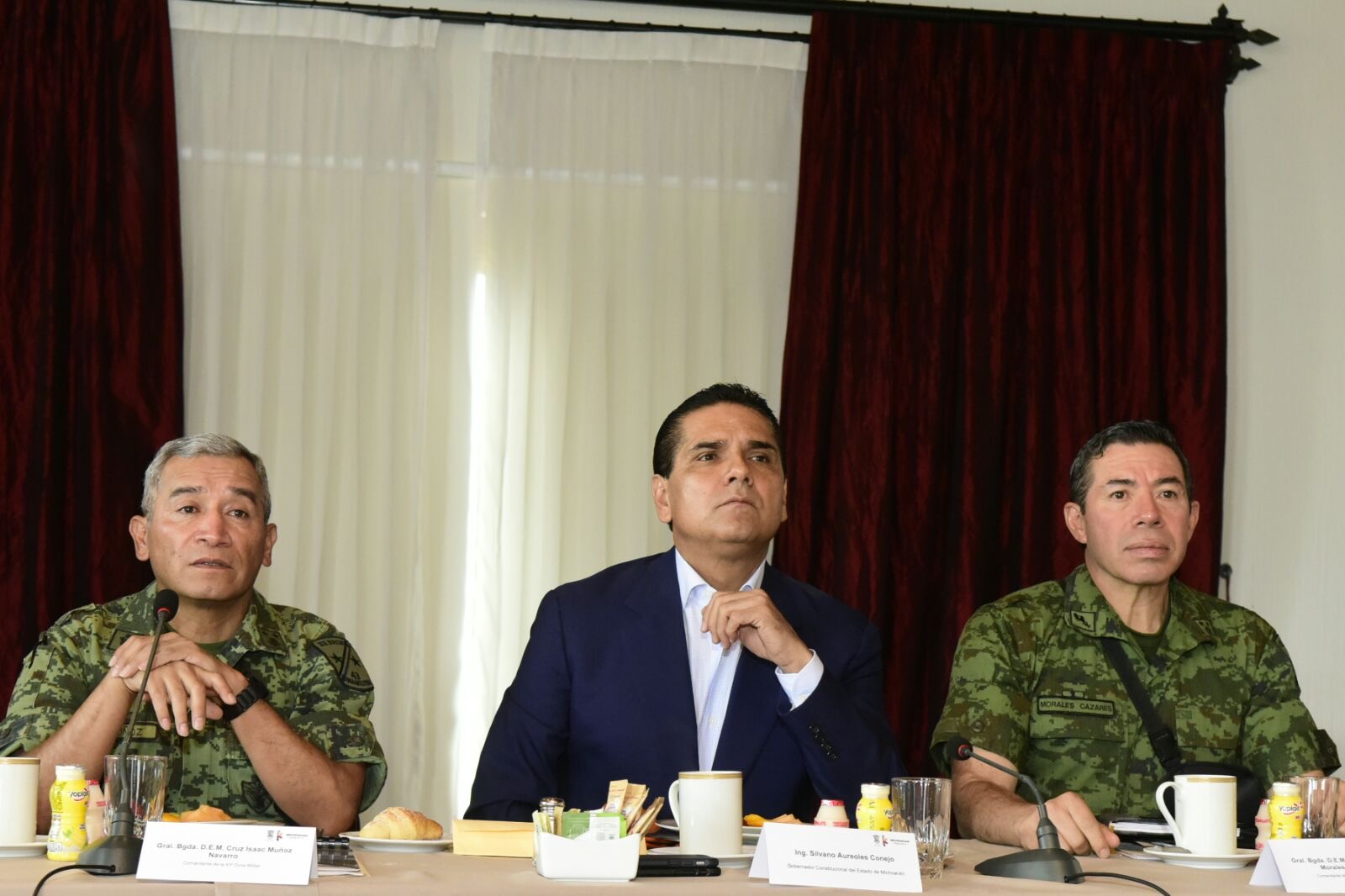Estuvieron presentes en esta reunión de trabajo, el secretario de Gobierno, Adrián López Solís; los comandantes de la 21 y 43 Zonas Militares, general José Francisco Morales Cázares y general Cruz Isaac Muñoz Navarro; el secretario de Seguridad Pública, Juan Bernardo Corona Martínez; el comandante de la 10 Zona Naval, vicealmirante Gonzalo Ortiz Guzmán.