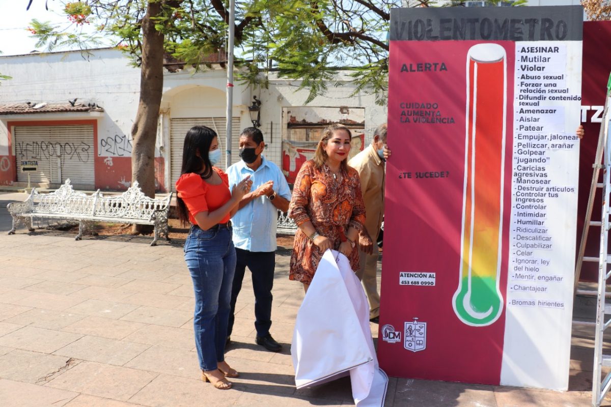 Apatzingán, Mich., a 27 de Abril del 2022.- Con la finalidad de que la mujeres se acerquen a las dependencias públicas a pedir ayuda en caso de recibir algún tipo de violencia, en el marco del Día Naranja las autoridades municipales a través de la dirección de la Mujer develaron el “Violentómetro” ubicado en la plaza conocida como Las Piedritas, para hacer conciencia de la importancia de detectar un acto violento y poder prevenir feminicidio.