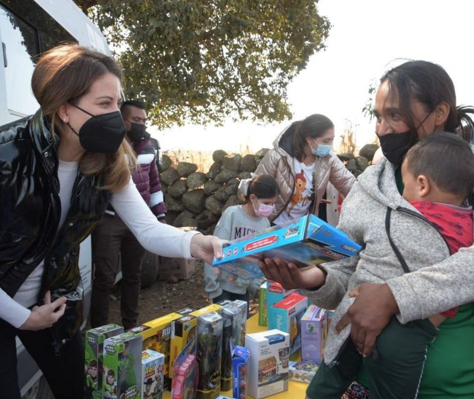 La presidenta honoraria del DIF, Paola Delgadillo, comenzó la entrega de juguetes en las comunidades de esta ciudad, donde niñas y niños la recibieron con gran ilusión y agradecidos por ser una gran ayudante de los Reyes Magos para llegar a donde ellos no pueden.