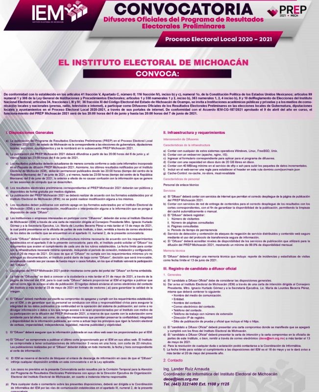Morelia. Mich., a 4 de Mayo de 2021.- Con el gusto de saludarles, me permito distraer su atención para informarles que ya está lista la convocatoria dirigida a instituciones académicas públicas, privadas y medios de comunicación nacionales, estatales y municipales; misma que contiene los requisitos que deben cumplir los interesados en participar como difusores oficiales del Programa de Resultados Electorales Preliminares (PREP), para este Proceso Electoral.