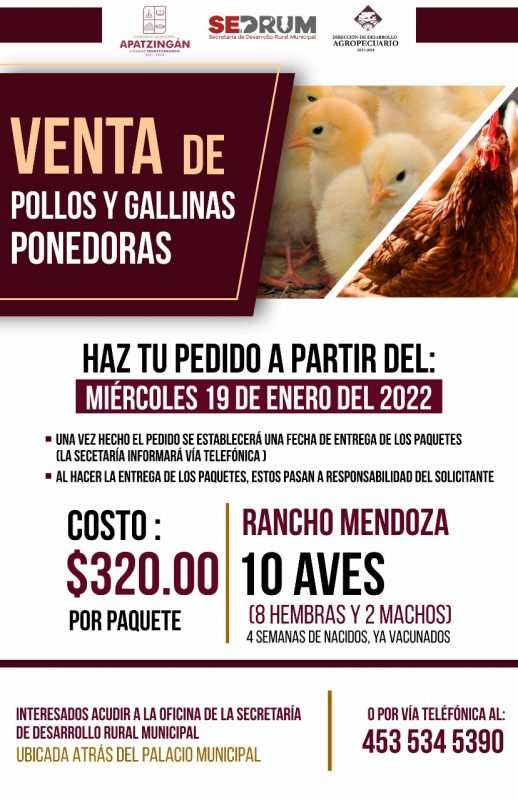 De acuerdo con el titular de la secretaría de Desarrollo Rural, Gustavo Gómez González, las personas que requieran el paquete de aves de cuatro semanas deben acudir a la oficina a partir del 19 de Enero para integrar su petición; con solo presentar una copia de su credencial de elector y realizar el pago correspondiente.