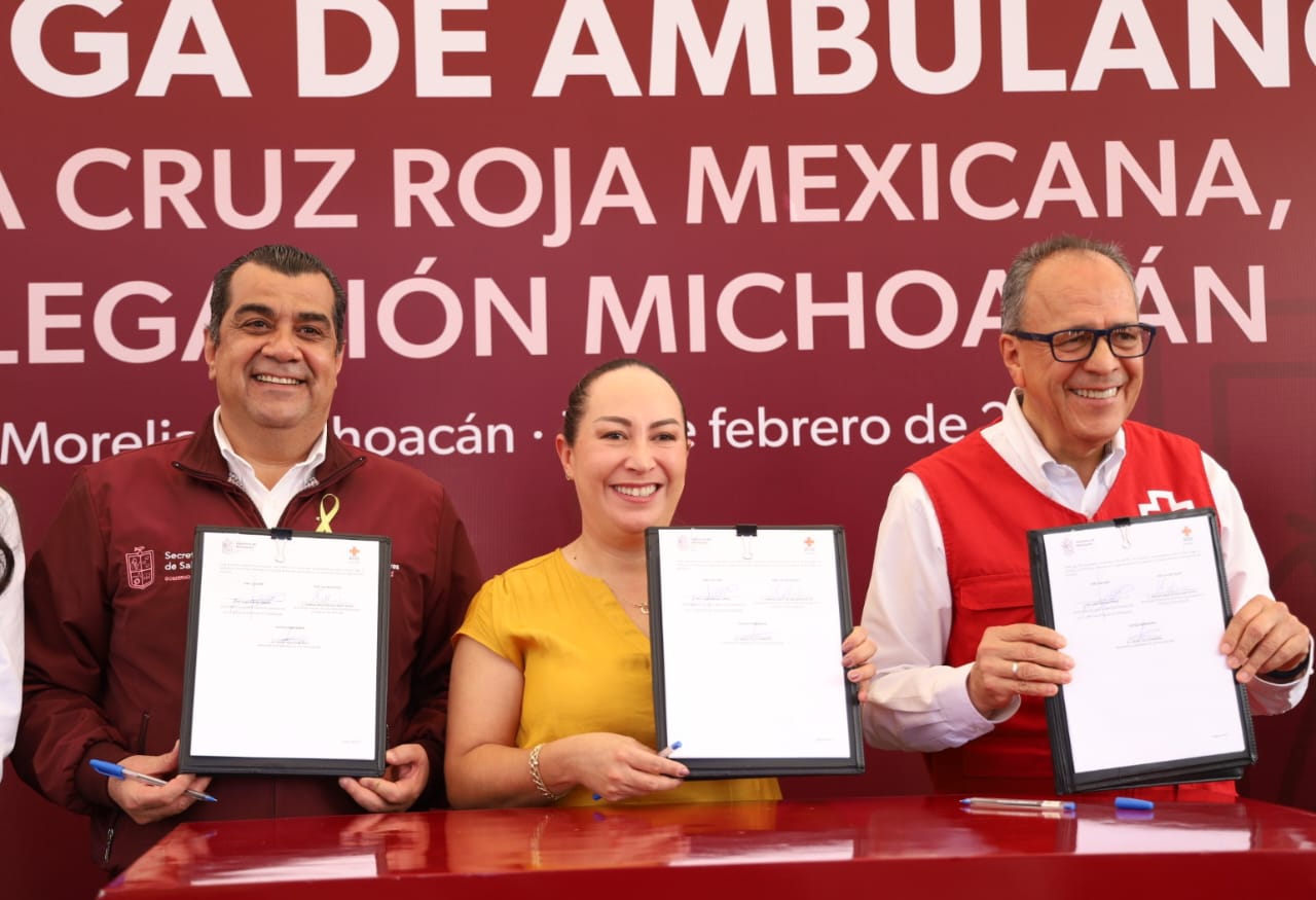 Morelia, Mich., 15 de Febrero de 2023.- La Secretaría de Salud de Michoacán (SSM) junto con el Sistema para el Desarrollo Integral de la Familia en la entidad (DIF), entregaron en donación una ambulancia de urgencias médicas avanzadas a la Cruz Roja Mexicana, Delegación Michoacán, con la que podrán reforzar los servicios que ofrecen frente a las emergencias.