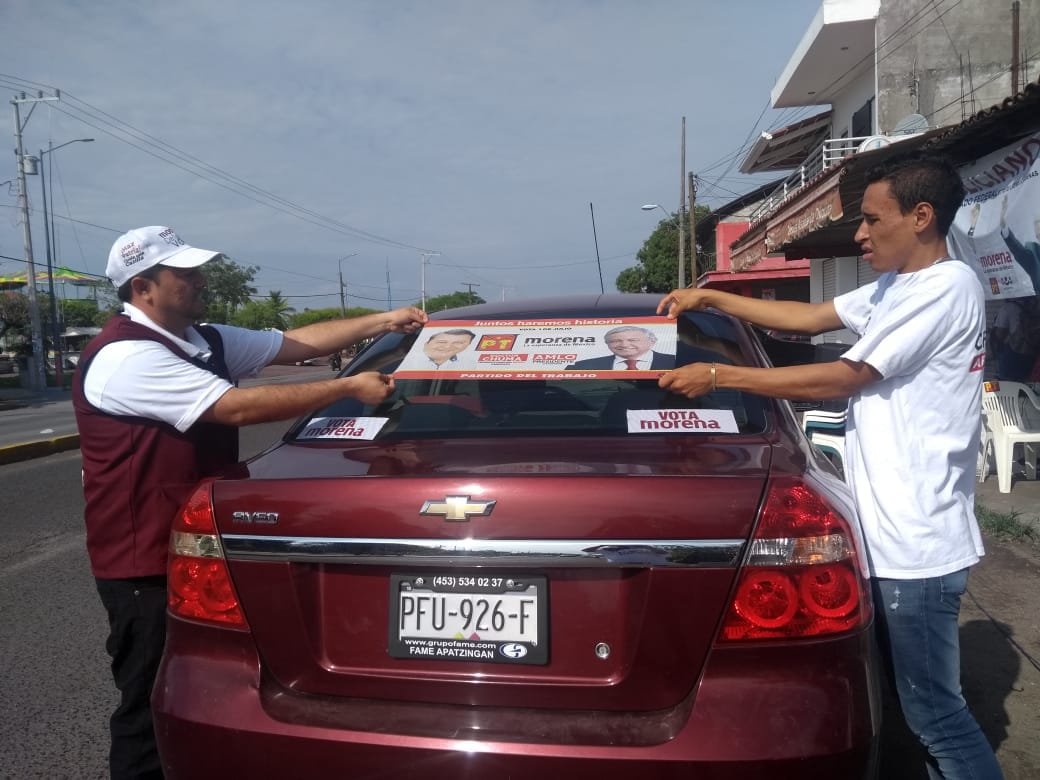 Múgica, Mich., a 10 de junio de 2018.- Hoy fue un domingo con alegría para la porra de la coalición Juntos Haremos Historia conformada por los partidos MORENA y PT al participar en el brigadeo en favor de sus candidatos repartiendo calcomanías, bolsas y mandiles a los automovilistas que amablemente pedian que les pagarán una calca.