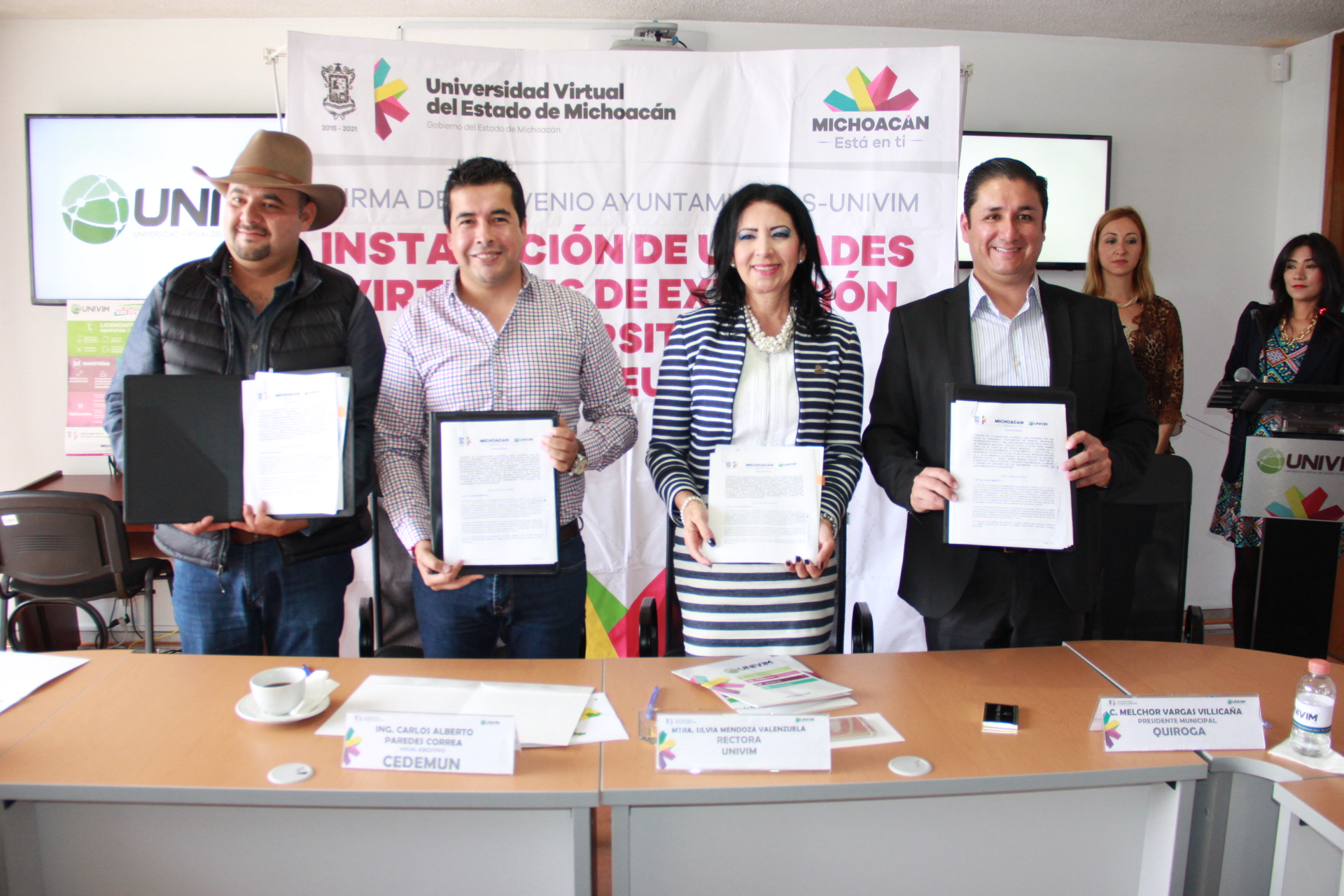 Morelia, Mich., a 15 de julio de 2016.- Con el propósito de ampliar la cobertura de la educación superior a distancia, la Universidad Virtual del Estado de Michoacán (Univim) y los ayuntamientos de Quiroga y Madero signaron el convenio de colaboración interinstitucional para la instalación de Unidades Virtuales de Extensión Universitaria (UVEUs) en esos municipios.