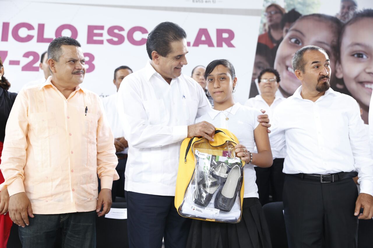 En presencia de padres de familia y vecinos de esta comunidad, Aureoles Conejo realizó la entrega simbólica de uniformes, libros de texto y útiles escolares a beneficiarios de preescolar, primaria y secundaria.