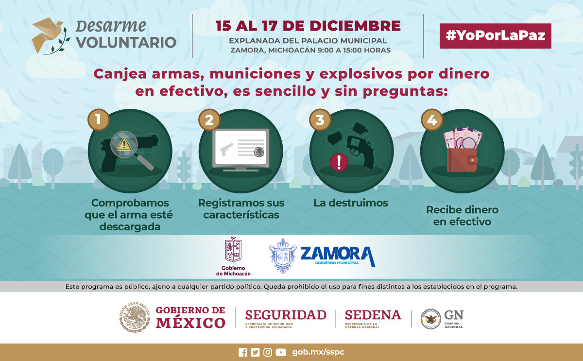 Por tal motivo, se invita a la ciudadanía a sumarse a este programa, para contribuir a reducir la violencia, destacando que al participar podrá obtener un beneficio económico dependiendo del tipo de arma, calibre y condición en la que se encuentre, asimismo, al hacer la entrega del armamento, no será objeto de ninguna investigación referente a la procedencia.