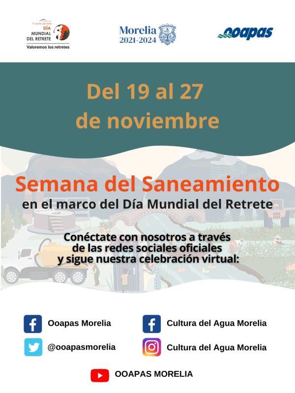 Del 19 al 27 de noviembre, el Organismo Operador de Agua Potable, Alcantarillado y Saneamiento de Morelia (OOAPAS) realizará “La Semana del Saneamiento”, una serie de actividades virtuales en el marco del Día Mundial del Retrete a celebrarse el próximo 19 de noviembre, fecha designada por la Organización de las Naciones Unidas (ONU) para sensibilizar a la opinión pública sobre los millones de personas que viven sin acceso a servicios de saneamiento gestionados de forma segura.