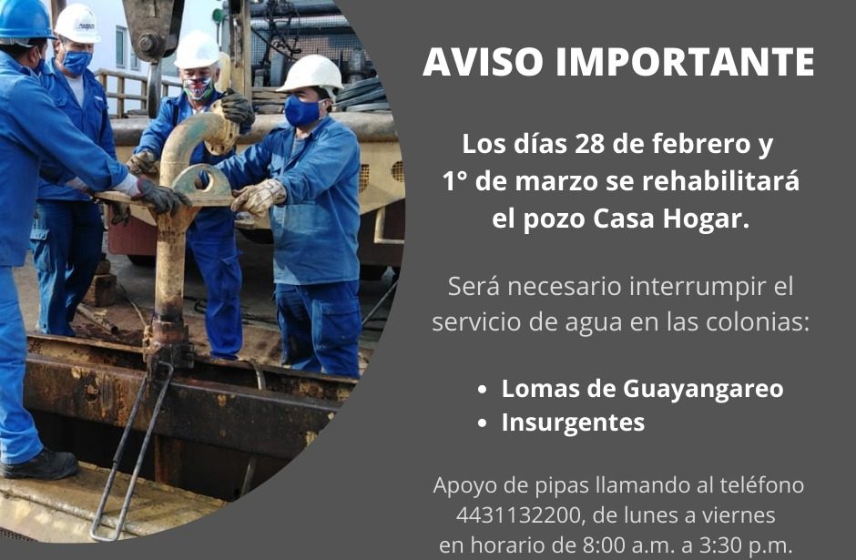 El pozo Casa Hogar saldrá de operación los días 28 de febrero y 1° de marzo, interrumpiendo el servicio de agua de las colonias Lomas de Guayangareo e Insurgentes durante los dos días señalados.
