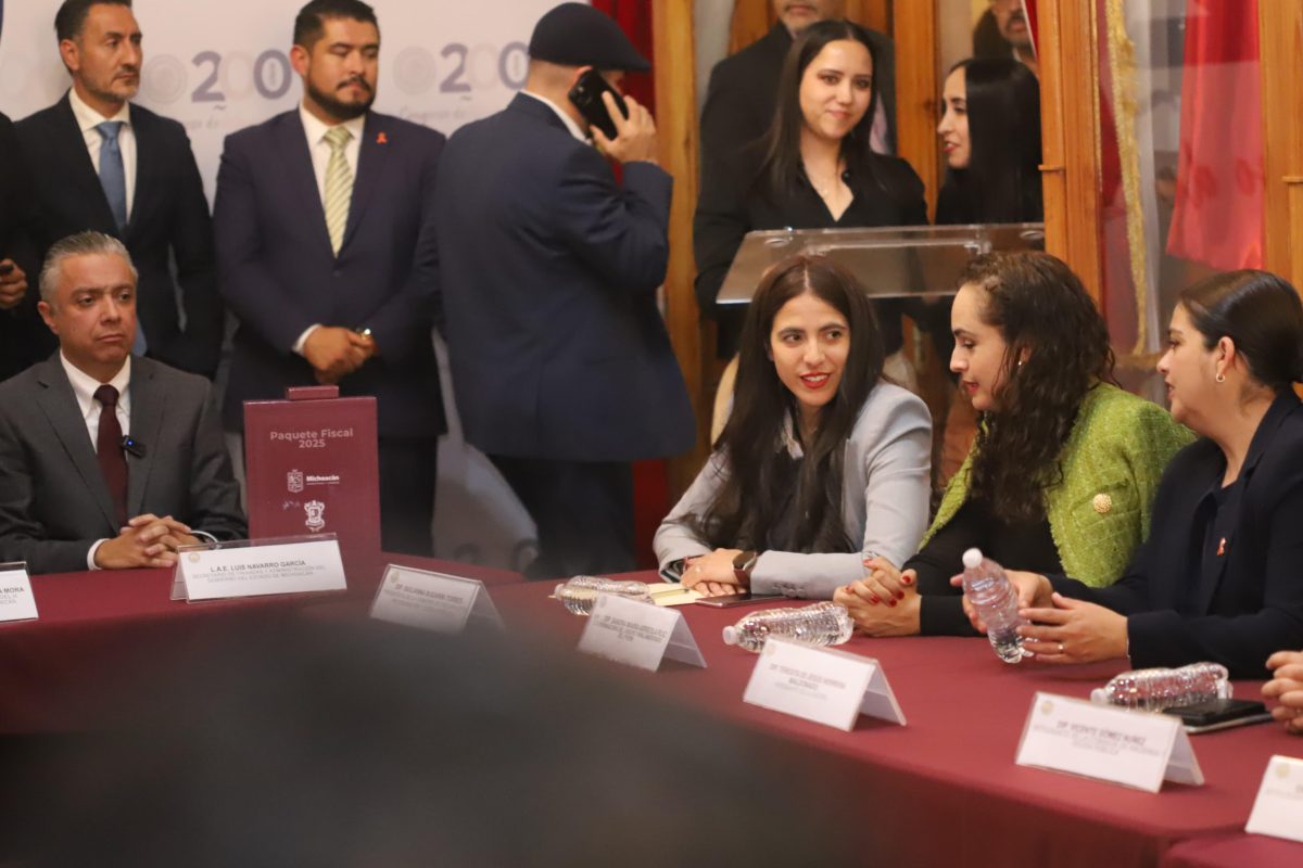Morelia, Mich., a 21 de Noviembre de 2024.- La presidenta de la Comisión de Programación, Presupuesto y Cuenta Pública del Congreso del Estado, Giulianna Bugarini, junto al presidente del Congreso del Estado, Juan Antonio Magaña de la Mora, recibieron en manos de Luis Navarro García, secretario de Finanzas, y Carlos Torres Piña, secretario del Gobierno de Michoacán, el Paquete Fiscal 2025, con el compromiso de analizarlo de manera responsable y garantizar que sea equilibrado, sin déficit, y que no contemple nuevos impuestos.