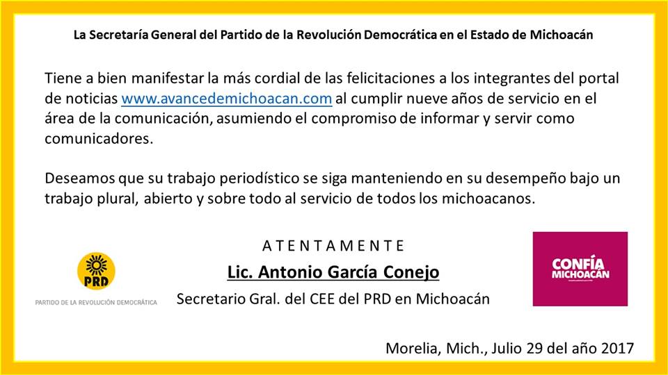 El Srio. Gral. del CEE del PRD, Antonio García Conejo, felicita en su Noveno Aniversario a Grupo Avance