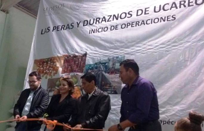 Morelia, Mich.,- Nuevamente y en el marco del esquema operativo del Instituto Nacional de la Economía Social –INAES-, buscando impulsar el valor agregado a los productos del campo; la delegada federal de la dependencia, licenciada Mónica Sánchez Cachú, llevó a efecto la inauguración de una nueva empresa social en la zona oriente del estado, denominada “Peras y Duraznos de Ucareo”.