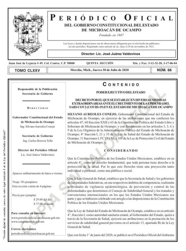 En el documento, publicado en el Periódico Oficial del Gobierno del Estado de Michoacán el 20 de enero del presente año, se establece el uso obligatorio del cubrebocas, para prevenir y contener la transmisión y riesgos de contagio del virus SARS-CoV-2, durante el tiempo que permanezca la emergencia sanitaria ocasionada por la pandemia del COVID 19 y hasta que la autoridad sanitaria competente, declare oficialmente su conclusión.