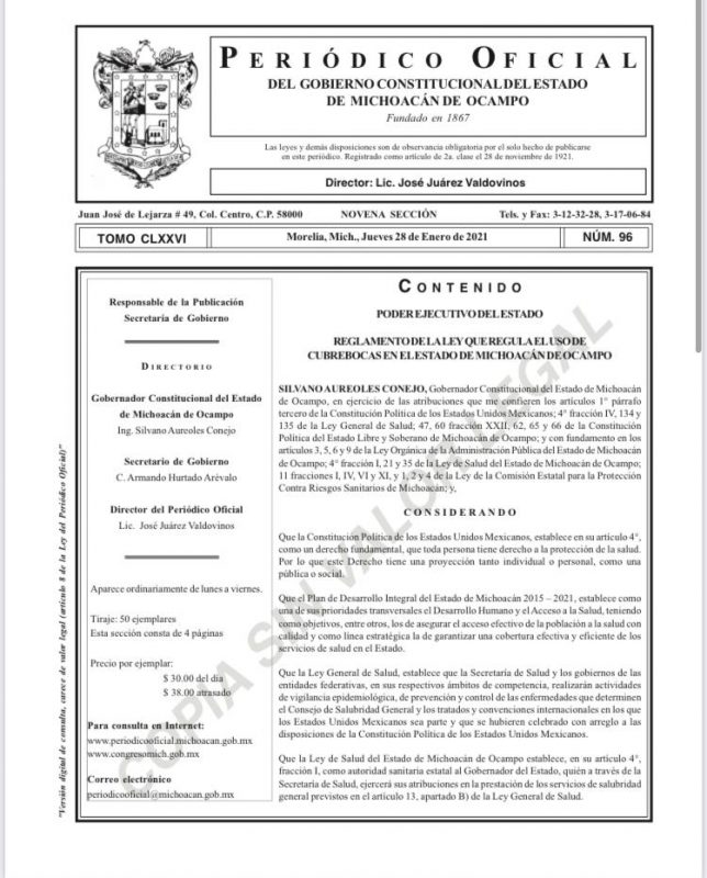 Morelia, Michoacán, a 30 de enero de 2020.- El Gobierno del Estado, que encabeza Silvano Aureoles Conejo, emitió el reglamento de ley que regula el uso obligatorio del cubrebocas en todo el territorio michoacano.