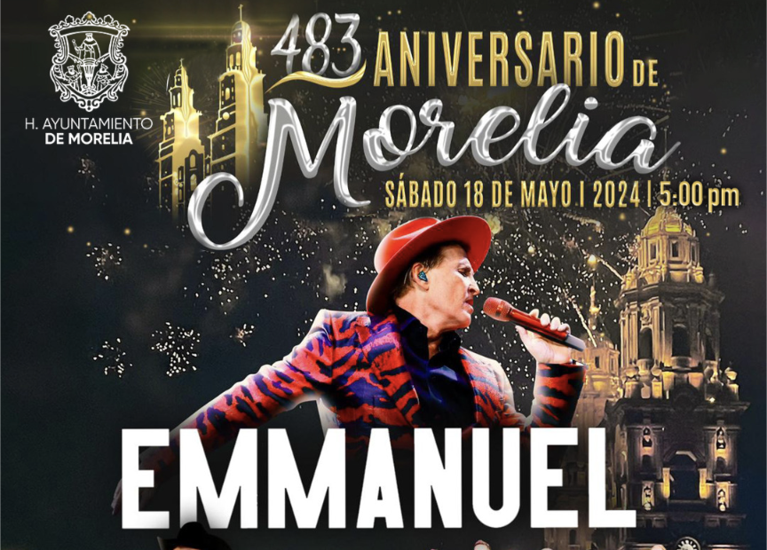 Morelia, Mich., 30 de Abril de 2024.- El Gobierno Municipal anunció que Emmanuel, Fidel Rueda y Grupo Cañaveral, son los artistas principales que pondrán a bailar y cantar a miles de morelianas y morelianos en el concierto por el 483 Aniversario de Morelia.