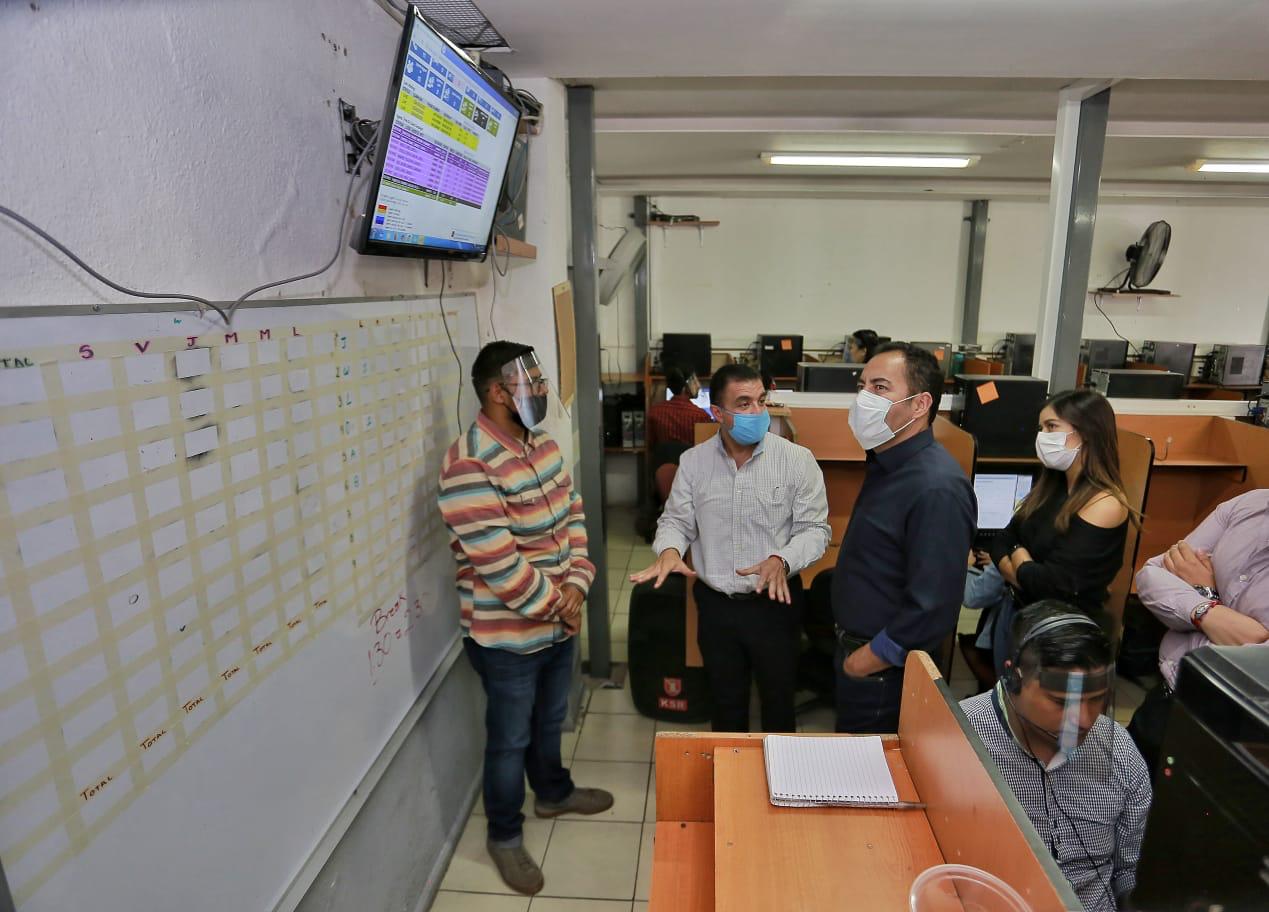 Morelia, Mich., 24 de abril de 2020.- El secretario de Gobierno, Carlos Herrera Tello visitó las instalaciones del Call Center que recibe las solicitudes de incorporación al programa Michoacán Alimenta, mismo que recibe más de mil llamadas por hora.