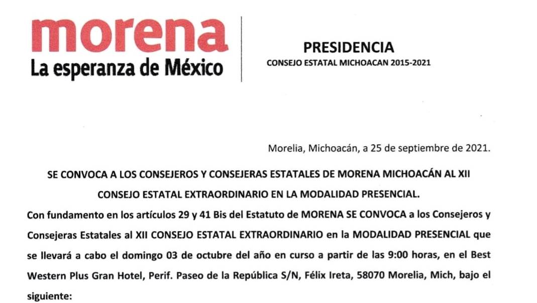 Morelia, Mich., a 3 de Octubre del 2021.- En medio de contradicciones, divisiones y confrontaciones, el décimo segundo consejo estatal de Morena en la entidad programado para éste domingo, simplemente fue cancelado.