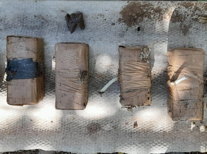 Al realizar patrullajes preventivos y de seguridad en un camino de terracería cerca de la localidad El Cansangue, municipio de Tepalcatepec, elementos de ambas instituciones ubicaron una bolsa en aparente estado de abandono, que contenía los explosivos.