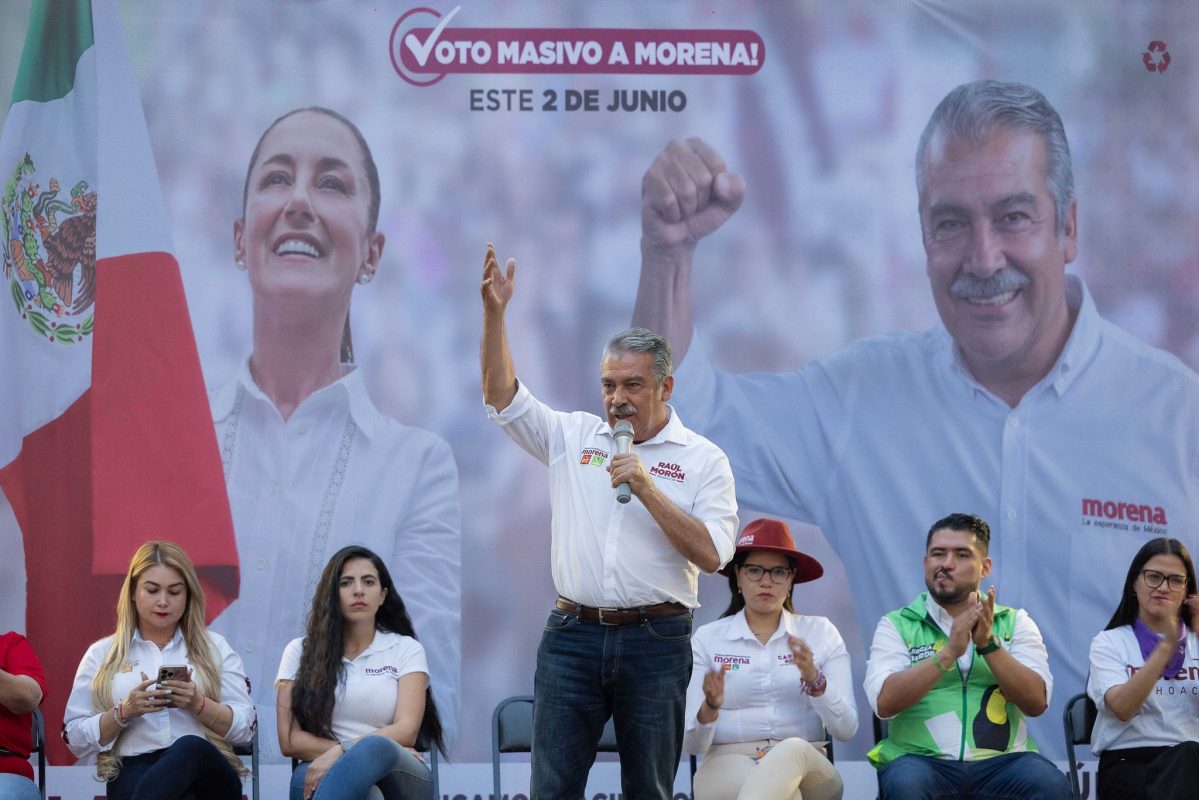 Morelia, Mich., a 08 de mayo de 2024. «Debemos de borrar a la derecha de Morelia, su gente reclama por un gobierno de la Cuarta Transformación», declaró desde el corazón de la capital michoacana, el candidato al Senado de la República por el estado, Raúl Morón Orozco.