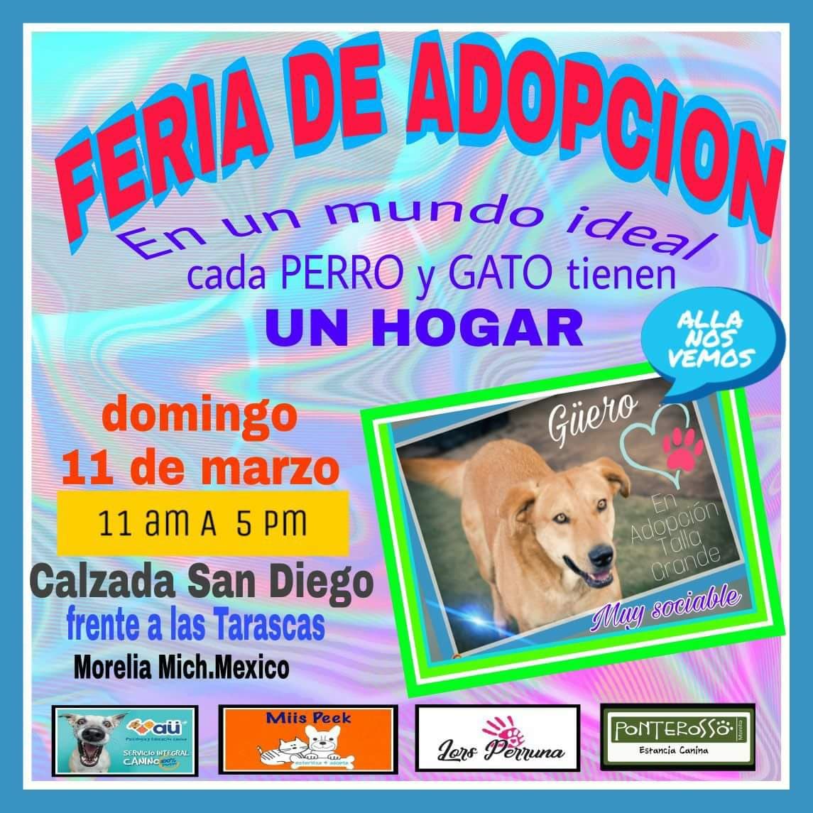 Morelia, Mich., marzo 2018.- En la entrada a la Calzada Fray Antonio de San Miguel, popularmente conocida como de San Diego, justo frente a Las Tarascas, este domingo se llevará a cabo, de las 11 a las 17 horas, la Segunda Feria de Adopción Canina y Felina del 2018, organizada por animalistas independientes y grupos como Miis Peek, Lors Perruna y Ponterosso.