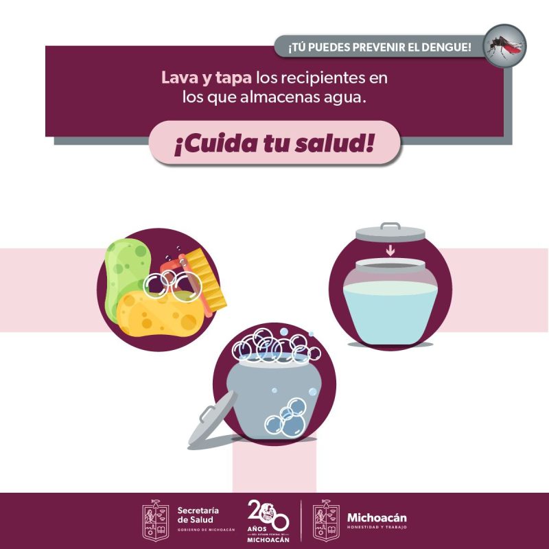 Morelia, Mich., 21 de junio de 2024.- En temporada de lluvias, la Secretaría de Salud de Michoacán (SSM) exhorta a la población a no bajar la guardia en la prevención del dengue, zika y chikungunya. Para ello recomienda lavar, tapar y voltear cualquier recipiente que acumule agua, ya que se convierte en criadero del mosquito _Aedes aegypti_.
