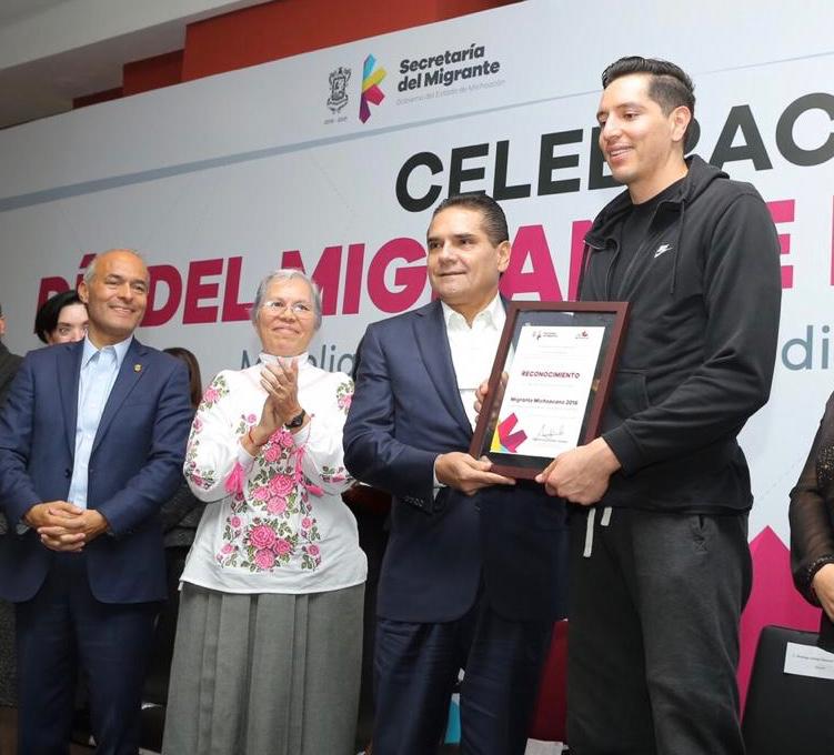 Acompañado del secretario del Migrante, José Luis Gutiérrez Pérez y ante presencia de migrantes, el mandatario estatal otorgó el Premio al Migrante Michoacano 2018, en reconocimiento a la labor y trayectoria de Irma Gloria Murrieta Murrieta y Rodrigo Adrián Zamora Fernández.