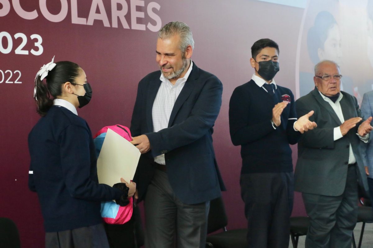 Morelia, Mich. 30 de agosto del 2022.- Bajo el compromiso de apoyar a las familias para que los estudiantes de educación básica tengan mejores condiciones para su desempeño escolar, el gobernador Alfredo Ramírez Bedolla, encabezó la entrega de útiles escolares para el ciclo escolar 2022-2023.