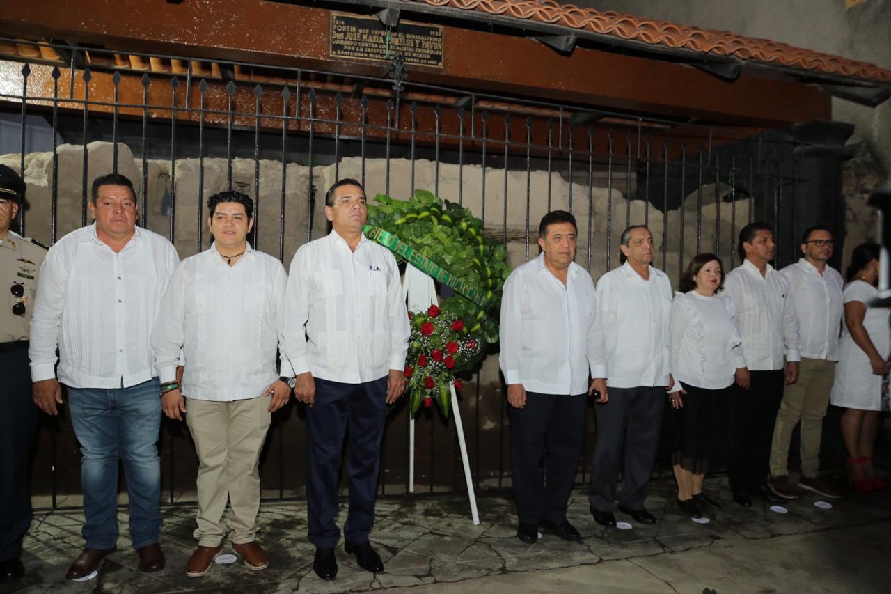 En punto de las 7:30 horas, el mandatario michoacano, acompañado de los representantes de los Poderes Legislativo y Judicial, así como de las autoridades municipales, colocó la ofrenda floral y montó guardia de honor en el Fortín Morelos.