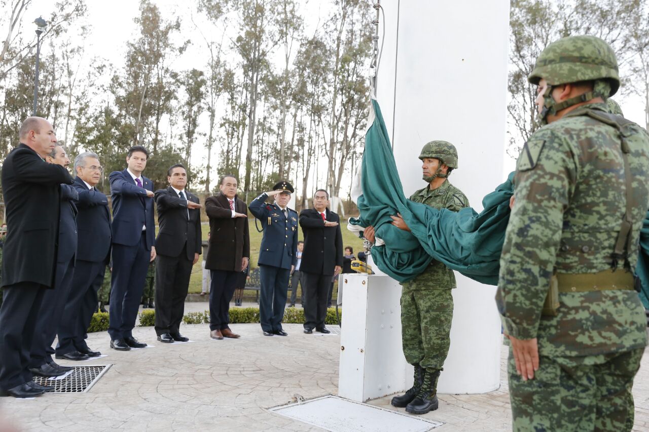 Morelia, Mich, a 24 de febrero de 2017.- En el marco de la conmemoración al Día de la Bandera, el Gobernador Constitucional Silvano Aureoles Conejo, así como autoridades de los tres órdenes de Gobierno y de los titulares de los Poderes Legislativo y Judicial, izaron la mañana de este viernes, la Bandera Monumental Nacional en la Plaza Cívica «Héroes de la Independencia».