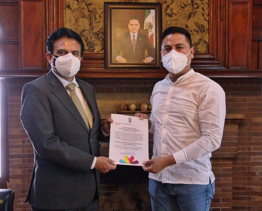 Morelia, Mich. a 23 de Marzo del 2021.- El secretario de Gobierno, Armando Hurtado Arévalo entregó el nombramiento a Eduardo Campos Gutiérrez, como encargado del Despacho del Instituto del Artesano Michoacano (IAM).