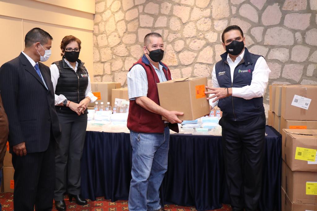 Al hacer la entrega de 20 mil caretas, 12 mil cubrebocas y 3 mil litros de gel antibacterial a los operadores del transporte, Aureoles Conejo reiteró la voluntad de su Gobierno para seguir escuchando, apoyando y ofrecer información a los transportistas.
