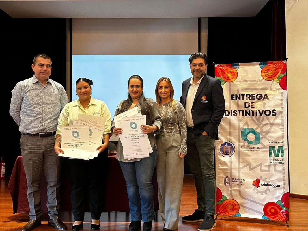 Morelia, Mich, 12 de febrero de 2024.– Con la intención de garantizar la confianza de turistas y visitantes, así como de usuarios locales, la Secretaría de Turismo de Michoacán (Sectur) entregó 13 distintivos de Punto Limpio a cuatro empresas del sector turístico de Morelia.