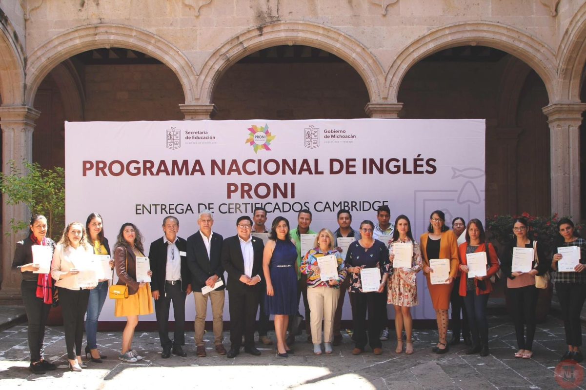 Morelia, Mich., 29 de marzo de 2023.- La Secretaría de Educación del Estado (SEE), a través del Programa Nacional de Inglés en Michoacán (PRONI), entregó a docentes la certificación del dominio del idioma inglés de Cambridge, First Certificate y de la Metodología de la enseñanza del mismo idioma, TKT.