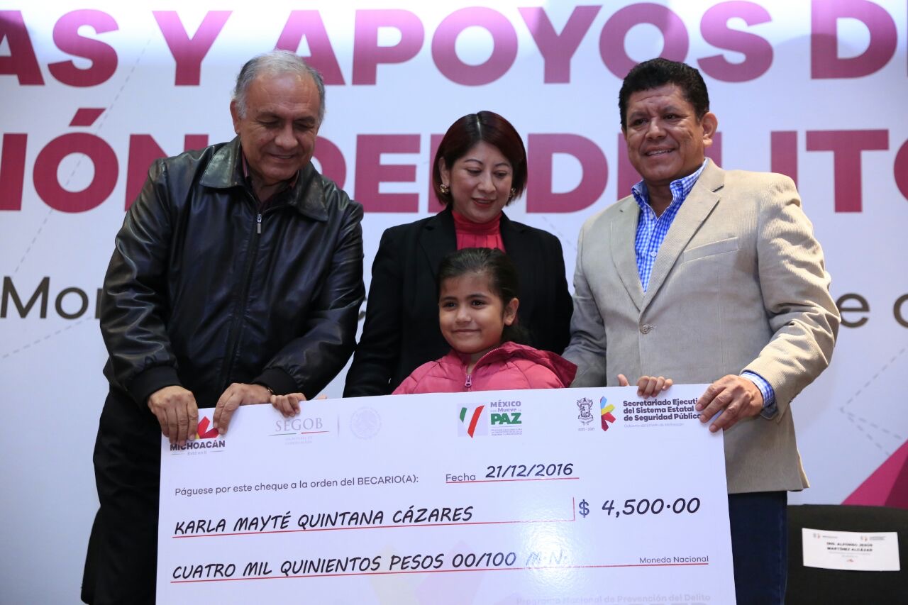 Morelia, Mich, a 21 de diciembre de 2016.- Como parte de las acciones para prevenir la violencia y la delincuencia atendiendo las causas sociales, el Gobierno del Estado y la Secretaría de Gobernacion a través de su delegación estatal, hicieron entrega de manera simbólica de parte de las más de 900 becas para niñas, niños y jóvenes de la entidad, que suman 7 millones de pesos, provenientes del Programa Nacional de Prevención del Delito (Pronapred).