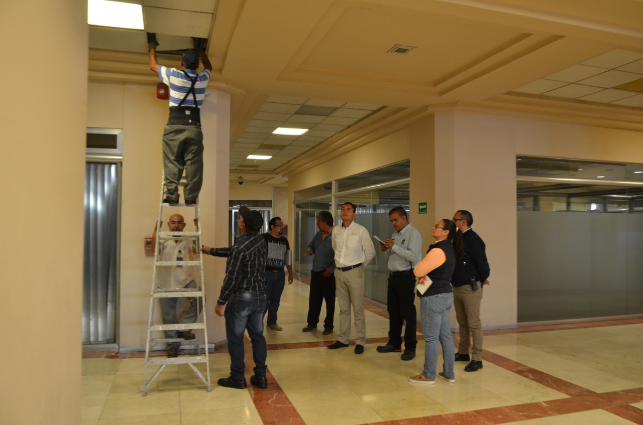Morelia, Michoacán, 20 de septiembre de 2017. Especialistas de Protección Civil, Secretaría de Obras Públicas del Estado, así como del Colegio de Ingenieros Civiles y de la Iniciativa Privada, realizaron una revisión minuciosa del edificio B del Palacio de Justicia José María Morelos, tras el fenómeno sísmico suscitado este 19 de septiembre.