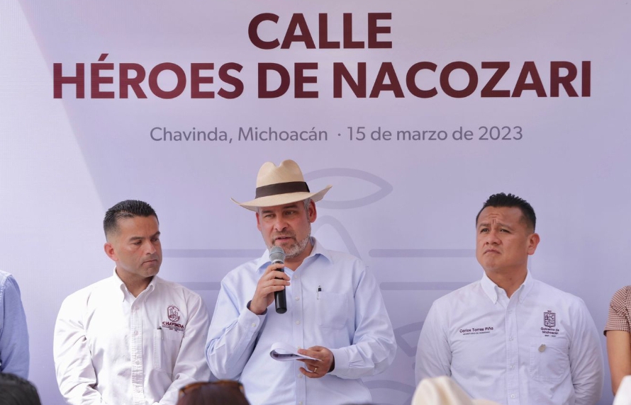 Chavinda, Mich., 15 de Marzo de 2023.-El gobernador Alfredo Ramírez Bedolla y el presidente municipal de Chavinda, Jaime Silva Gil, inauguraron la pavimentación de la calle Héroes de Nacozari, en la que se invirtieron más de 2.5 millones de pesos a beneficio de mil habitantes.