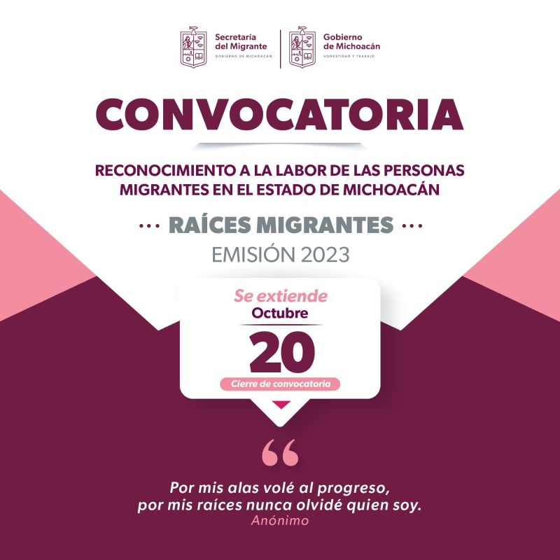 Para más información sobre la convocatoria los interesados pueden visitar el sitio https://migrante.michoacan.gob.mx/convo…/raices-migrantes/; acudir a la Secretaría del Migrante, ubicada en la calle Colegio Militar 230, en la colonia Chapultepec Norte, en Morelia, Michoacán, de 9:00 a 16:00 horas; comunicarse al teléfono 443 322 9100 extensión 134; o escribir al correo electrónico reconocimiento.migrante.mich@gmail.com.