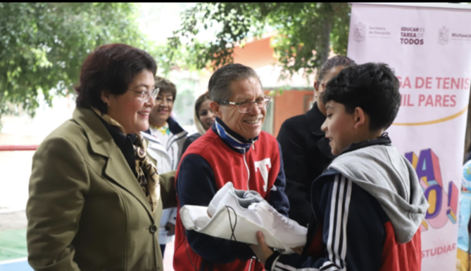 Alumnas y alumnos de la Secundaria Técnica 108 de Morelia recibieron alrededor de mil 800 pares de calzado escolar, y la Federal Rafael Carrillo de Zinapécuaro casi mil.