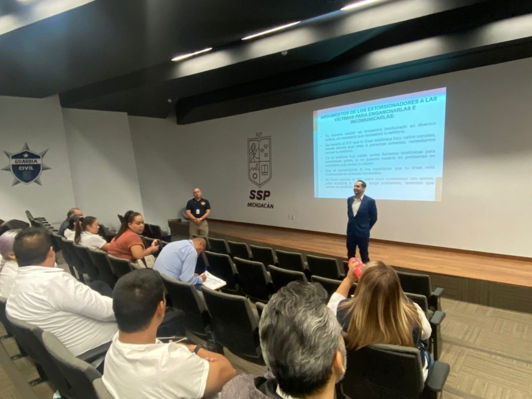 Morelia, Mich.,  a 22 de junio de 2024.- En el marco de las acciones que lleva a cabo para atender y erradicar conductas delictivas que laceran a la sociedad, la Fiscalía General del Estado de Michoacán (FGE), a través de la Unidad Especializada en Combate al Secuestro (UECS), capacitó a personas servidoras públicas del Centro Estatal de Comando, Comunicaciones, Cómputo, Control, Coordinación e Inteligencia (C5i), en materia de extorsión y secuestro virtual.