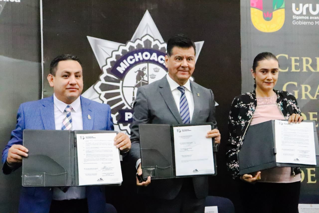 Acompañado del alcalde Víctor Manuel Manríquez y el director General del Instituto Estatal de Estudios Superiores en Seguridad y Profesionalización Policial (IEESSPP), Comisario Antonio Bernal Bustamante, aplaudió el valor y la vocación de servicio de las 92 mujeres y hombres que se integran a la Policía Municipal de Uruapan en el marco del acuerdo signado con el estado, a quienes externó el apoyo total del gobierno estatal al municipio en beneficio de su Policía.