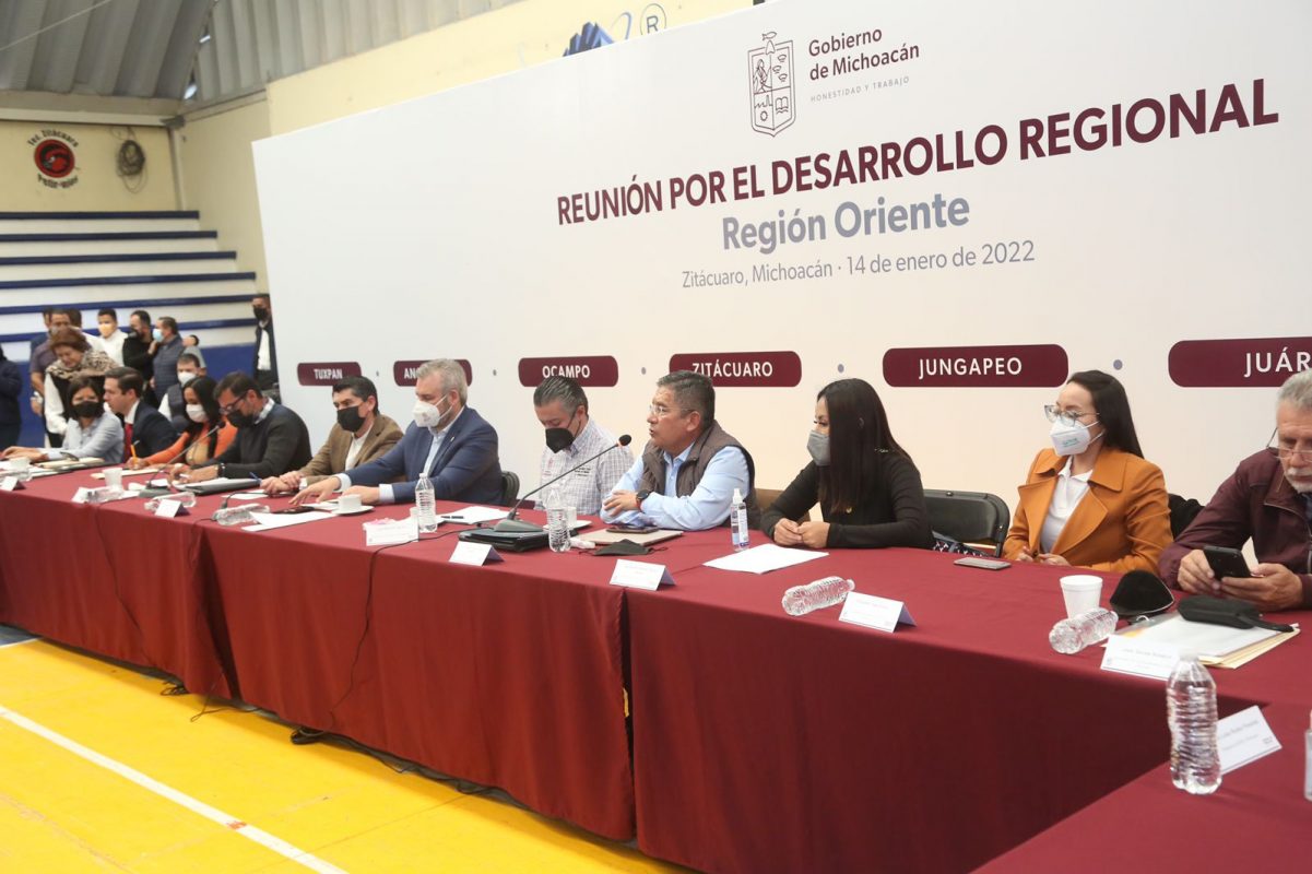 Zitácuaro, Mich., a 15 de Enero del 2022.- Durante la Mesa por el Desarrollo «Región Oriente», encabezada por el Gobernador del Estado, Alfredo Ramírez Bedolla, el secretario de Seguridad Pública, General José Alfredo Ortega Reyes, y diversas autoridades estatales y municipales, se abordaron los beneficios que se implementarán en materia de seguridad mediante el Fondo para el Fortalecimiento de la Paz (Fortapaz).