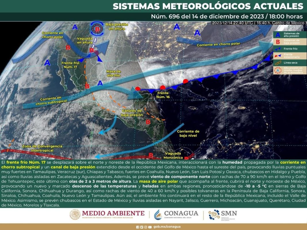 De acuerdo con el pronóstico, se espera que la masa de aire polar que acompaña el frente frío número 17, mantenga un descenso de temperatura durante la madrugada y mañana del viernes, lo que provocará intervalos de lluvias en el transcurso del día.