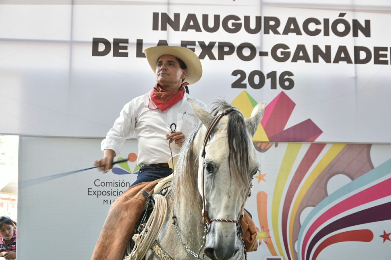 La Goleta, mpio., de Charo, a 05 de Mayo de 2016.- Con una cabalgata alrededor de las instalaciones de la Expo Fiesta Michoacán 2016, el Gobernador Constitucional Silvano Aureoles Conejo, inauguró la Expo Ganadera en el Recinto Ferial, donde a tan sólo unas horas de la apertura, ya se tiene una venta comprometida de alrededor de 200 ejemplares, de los 500 expuestos, lo que aseguró, da muestra de que los productores y expositores, han recuperado la confianza en Michoacán.